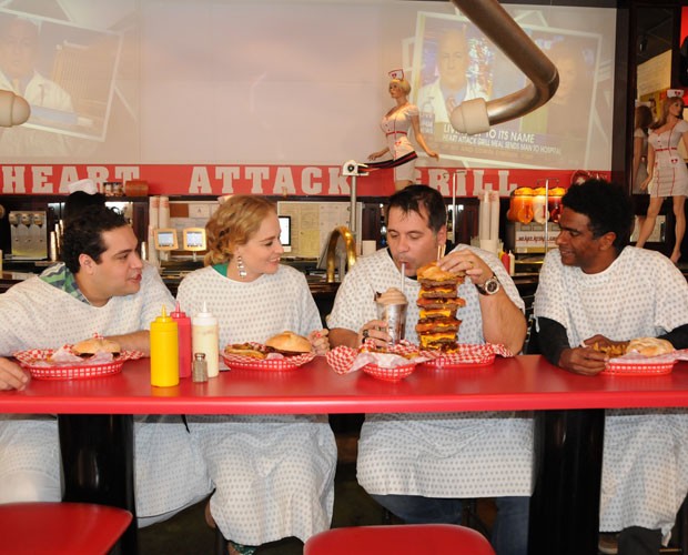 Na lanchonete com clima de hospital, na qual todas as garçonetes vestiam roupas de enfermeira e os clientes de paciente - uma brincadeira com a possibilidade de os comilões passarem mal depois de comer tanta gordura -, Leandro se pesou e falou sobre sua forma física. “Eu estava em um controle alimentar, fazendo aquela dieta de pontos. Mais pela saúde, não tenho problema de ser gordo. O negócio é quando você começa a se sentir mal. Faço um humor muito físico. Gosto de pular, dar cambalhota e tal. Às vezes eu sinto: "Opa, passei do gordo que me deixa tranquilo", ai é a hora que eu dou uma reduzida”, contou ele.